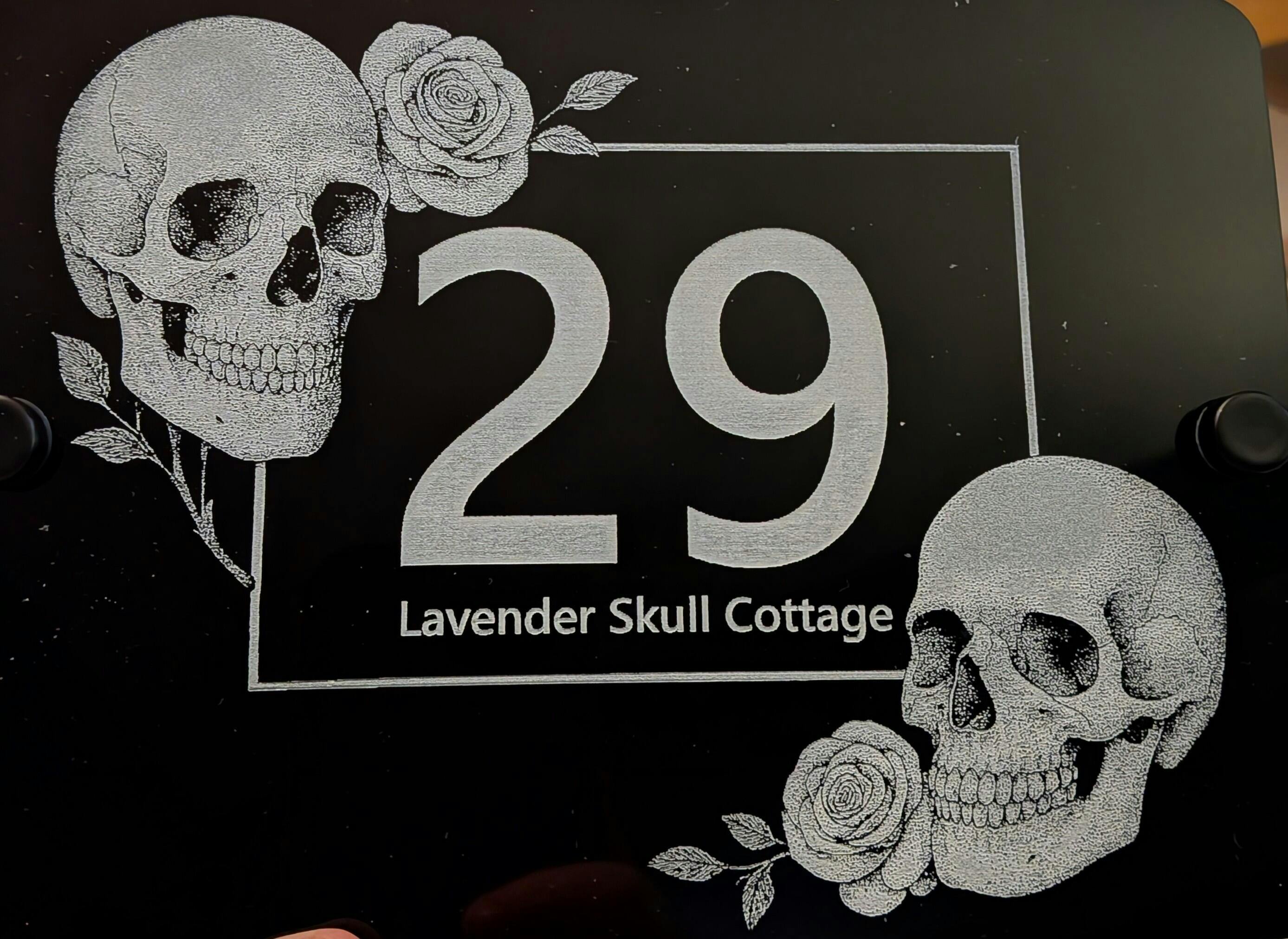 I am absolutely delighted with my new Skulls and Roses house sign. I moved into my house recently and was looking for something 'me' for the front. I am a fan of all things a bit different and knew I didn't want the usual run of the mill type design. When I saw this I knew it was exactly what I wanted. It's great! Chris from the company was very helpful and fast at getting in touch with me about the design and processed the order extremely quickly especially as it was over the Christmas holidays. I received the order within a few days also which was brilliant! I can't recommend the company enough. I am so pleased with my order and can't wait to get it put up outside! Thanks a million for everything!